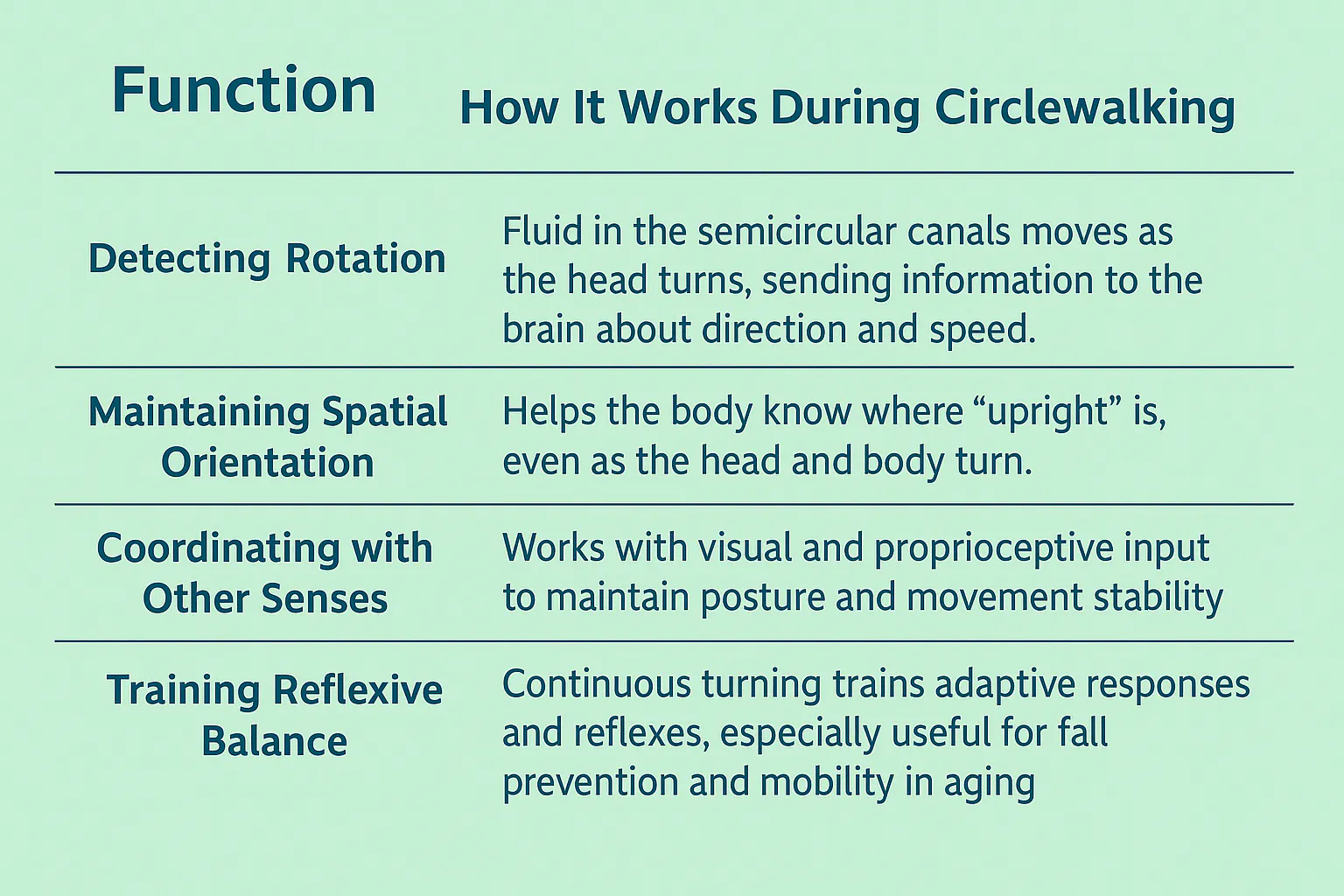 Circlewalking is a mindful, integrative movement practice that harmonizes physical stability, sensory coordination, and mental focus. It strengthens balance through dynamic turning, sharpens the mind through novel movement, and fosters whole-body awareness through the continuous dialogue between the vestibular, visual, and proprioceptive systems.