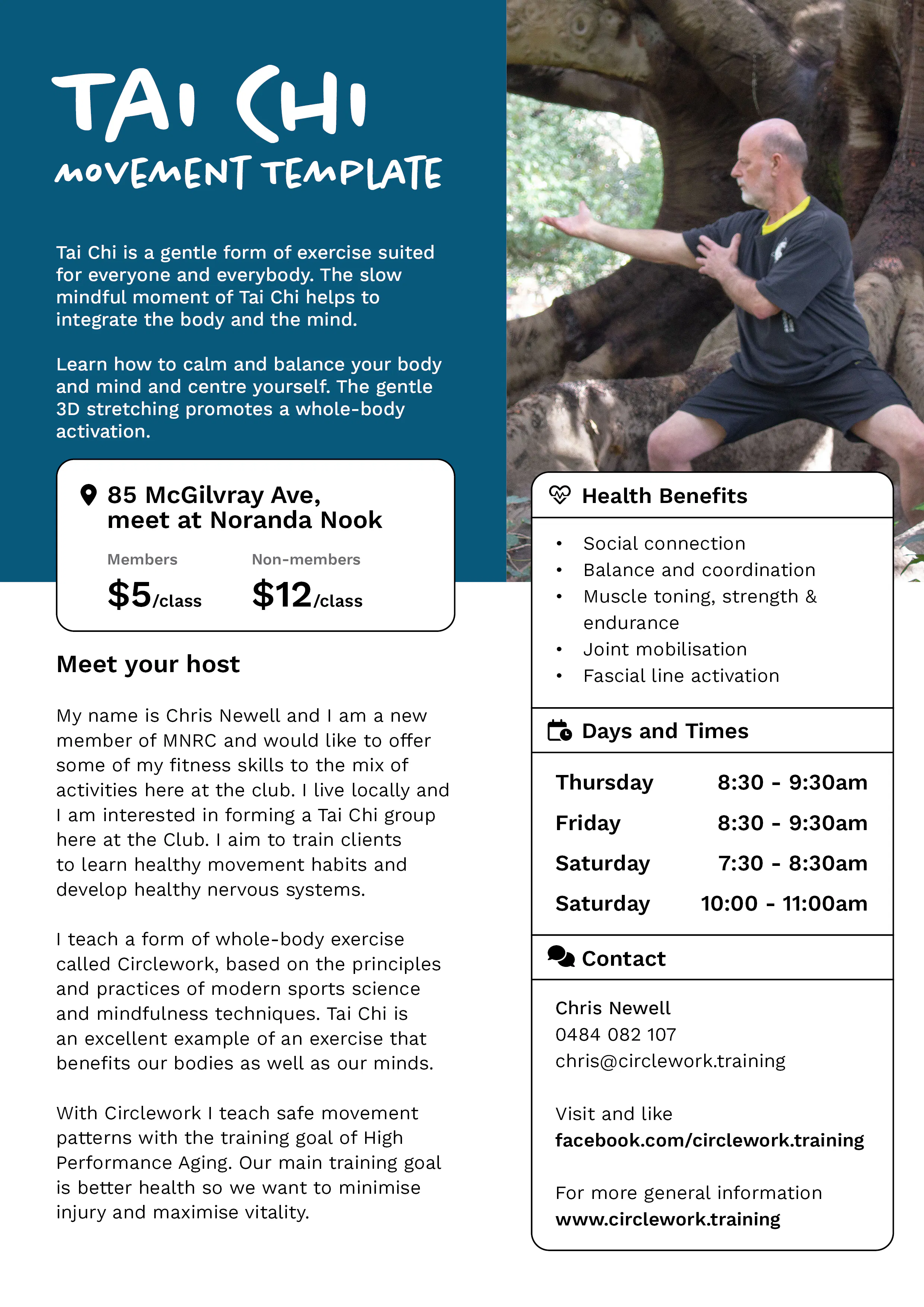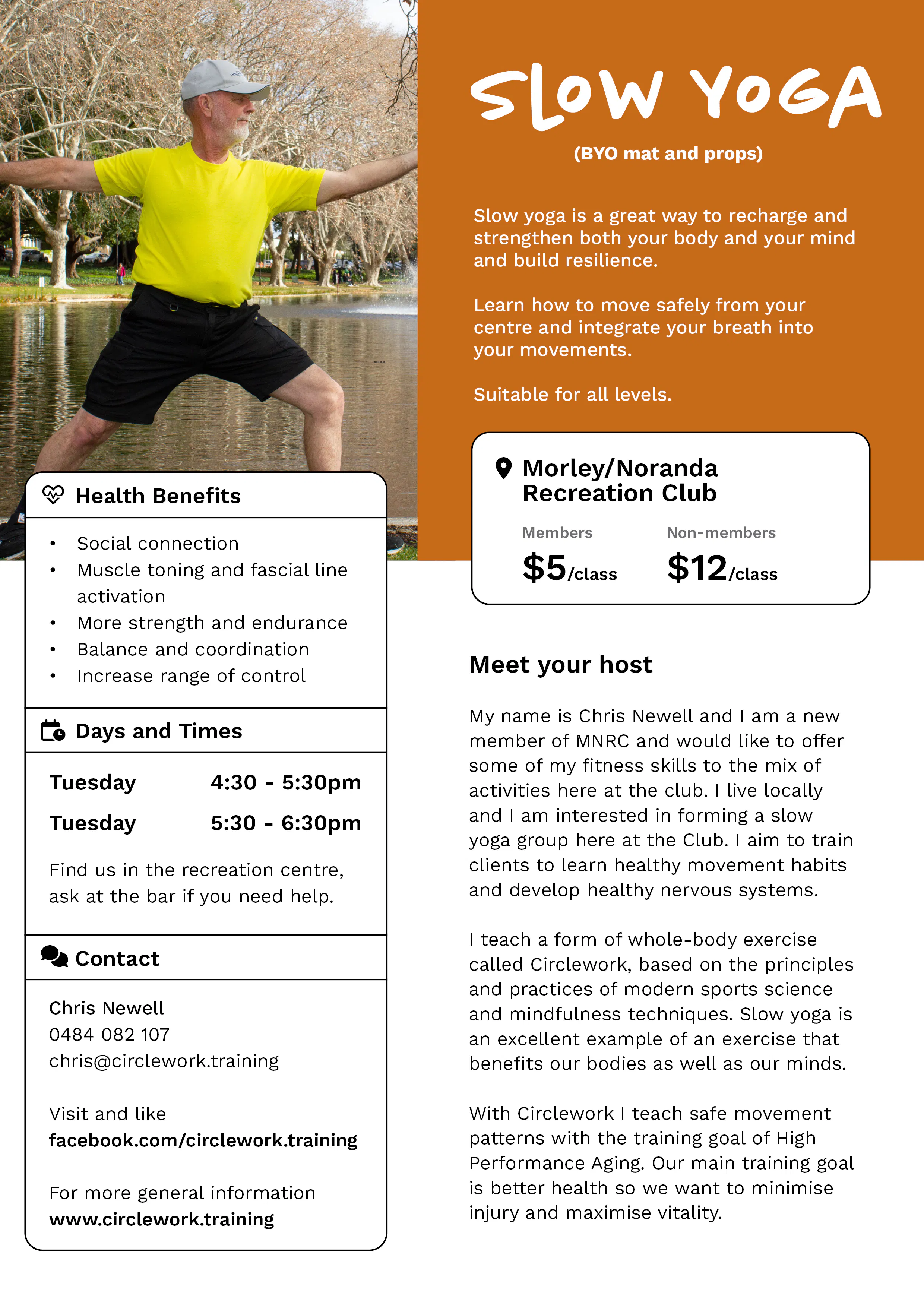 I will be offering a mix of Slow Yoga, Qi Gong and Tai Chi movement template. The yoga will be held in the club rooms (ask at the bar) and the Tai Chi will be outside at the Noranda Nook, just behind the Noranda Shopping Center (look for the yellow agility pole)>